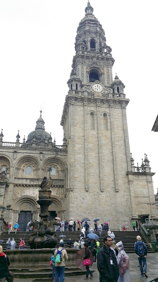 Además de presentar este trocito de mi tierra en forma de pulpo a la plancha, no me resisto a poneros una foto de la Plaza de Platerías en Santiago de Compostela. Mi fachada favorita de la catedral, la que me pone la piel de gallina. Aunque podéis ver que, como no, aquel día llovía en Santiago y no pierde ni un ápice de su inconmensurable belleza. Este lugar es otro pedacito de este corazón gallego que os habla y no podía dejar de compartirlo con vosotros.