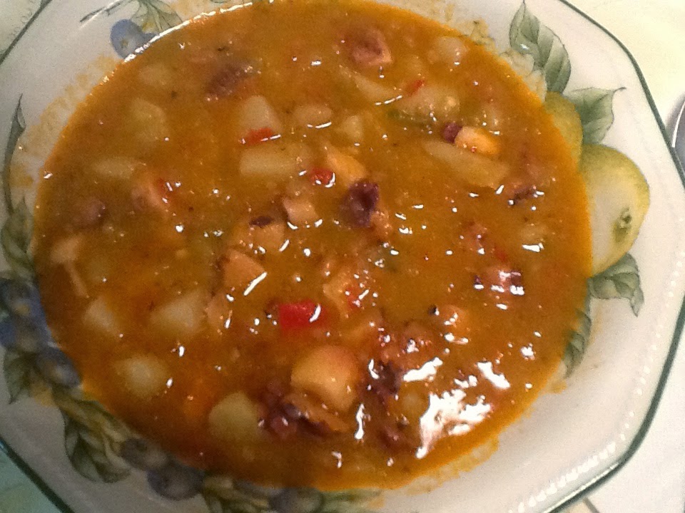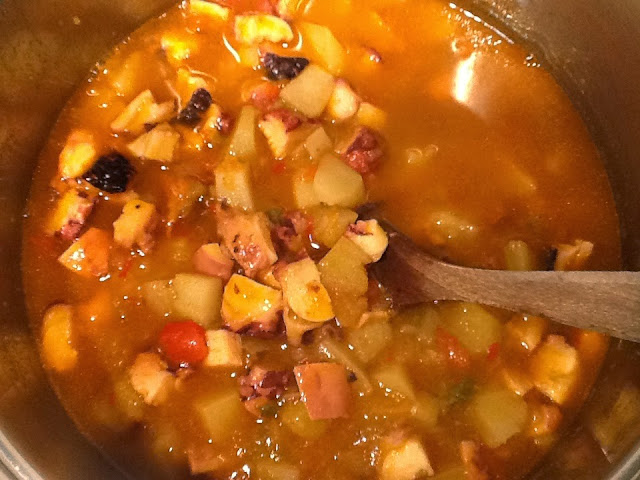 Lo dejamos cocer a fuego medio aproximadamente 20 o 25 minutos, hasta que veais que las patatas estan bien cocidas y se deshacen un poco. En ese momento añadimos el pulpo cortado y lo dejamos hacerse 5 minutos más y servimos.