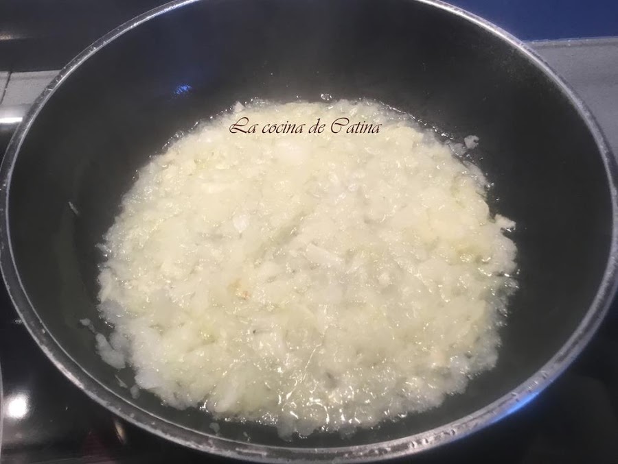 En una sartén con un chorro de aceite, rehogamos la cebolla y los ajos con sal, pimienta y la guindilla, hasta que veamos que la cebolla empieza a dorarse.