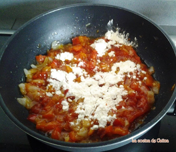le añadimos la cucharadita de harina, seguimos friendo para que no se hagan grumos, incorporamos las cucharadas de tomate frito.