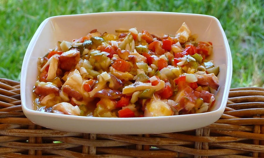 Es tan sencillo como cortar el pulpo con unas tijeras en trozos no muy grandes y picar muy finos el resto de los ingredientes.