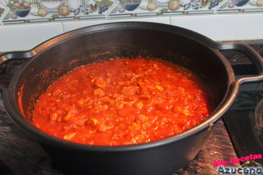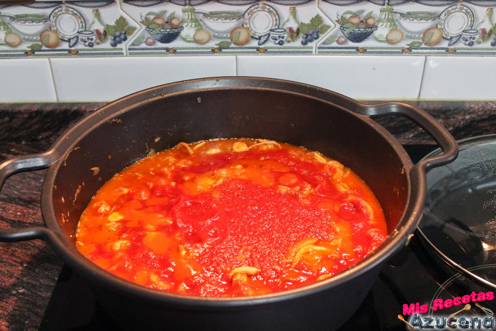 Una vez este el vino reducido añadiremos el tomate triturado, este lo dejaremos hasta que reduzca y se pierda todo el agua que tiene el tomate, aquí no hay tiempo depende del tipo de tomate que utilicemos.