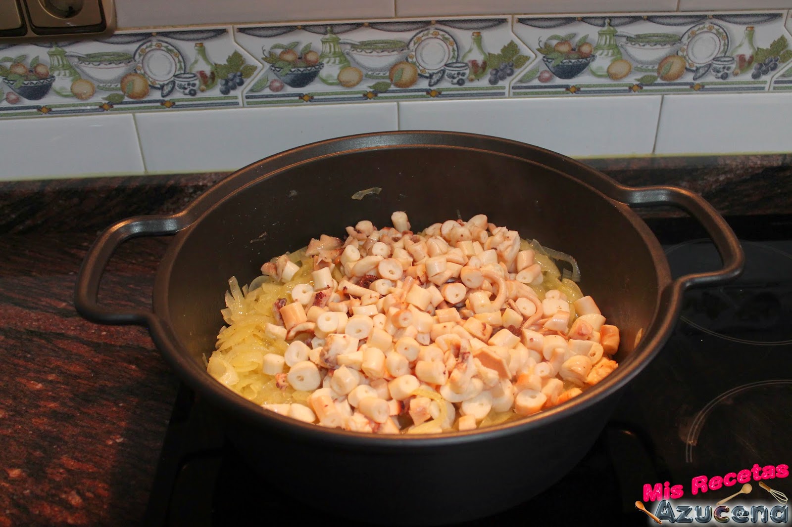Pasados los 20 minutos por la cebolla añadiremos el pulpo, removemos todo y lo dejamos otros 10 minutos más.