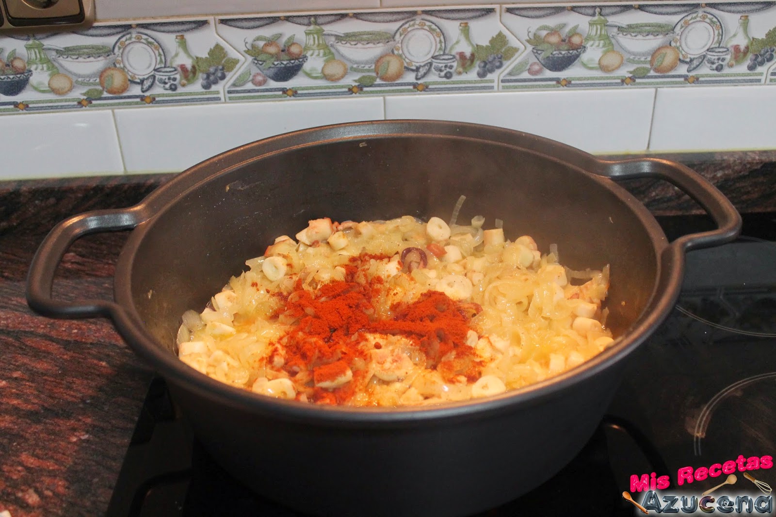 Transcurridos los 10 minutos añadiremos el pimentón, removemos bien y lo dejamos sofreír 1 minuto o un poco más, pero esta vez no dejaremos de remover para que no se nos queme el pimentón.