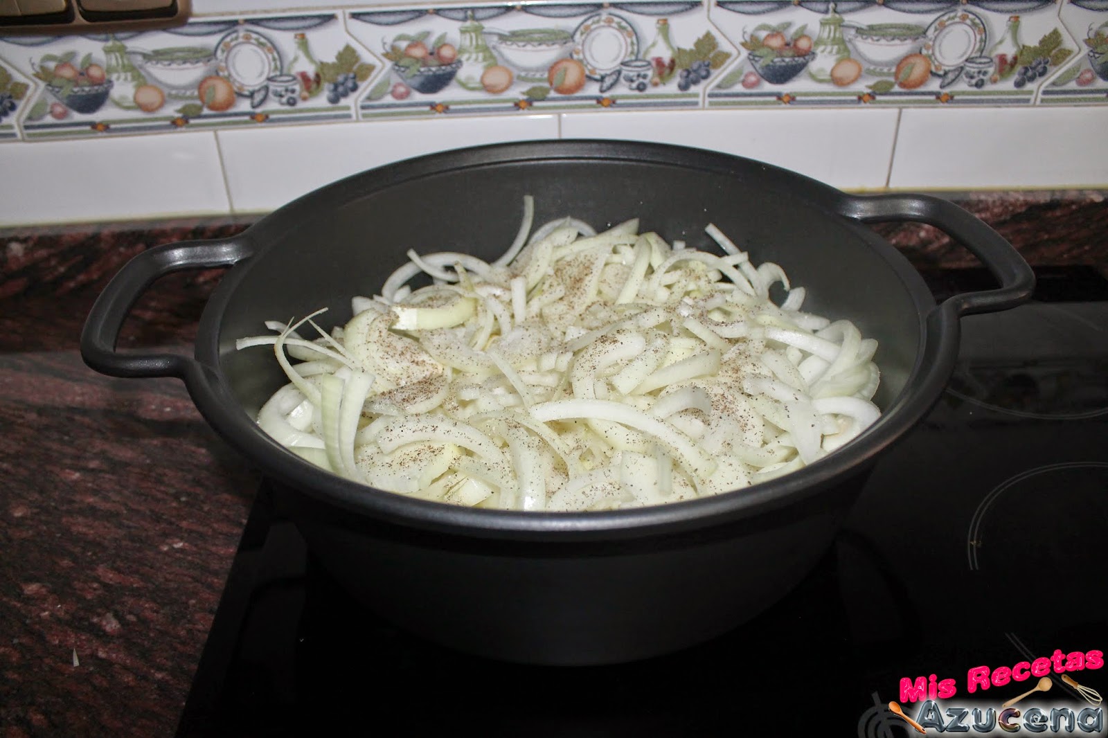 Una vez tengamos toda la cebolla picada pondremos una sartén a la fuego, a fuego medio, cuando este caliente pondremos un buen fondo de aceite, pondremos la cebolla, salpimentamos y la dejamos sofreír durante 20 minutos.