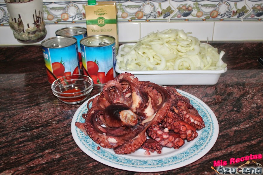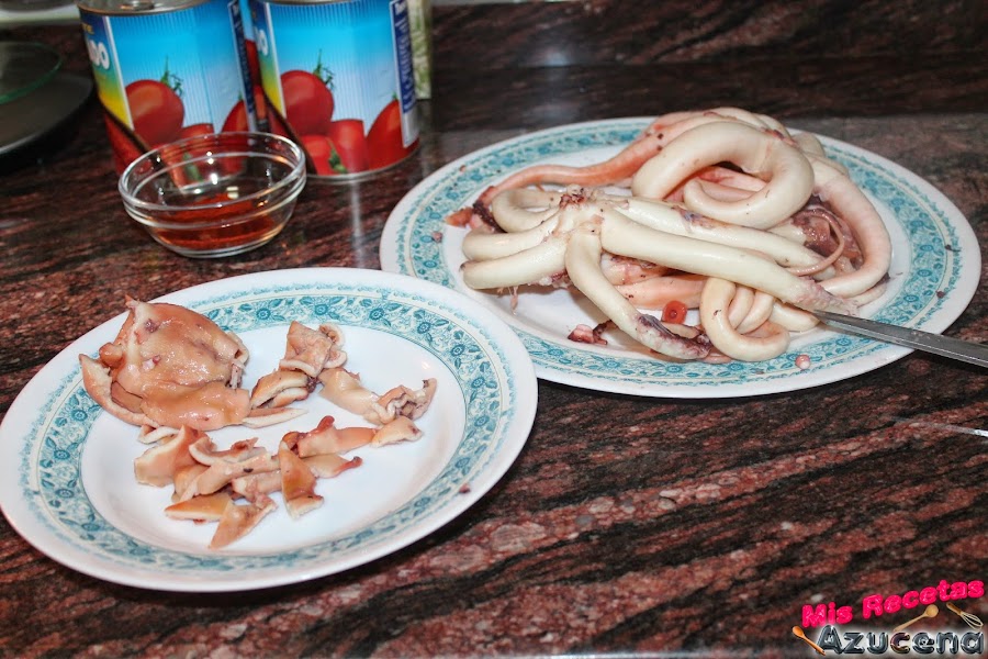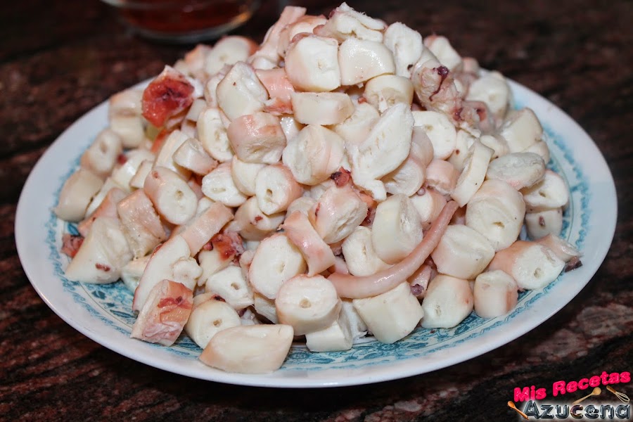 Mientras se sofríe la cebolla cogeremos el pulpo y lo limpiaremos, una vez limpio lo trocearemos en trozos no muy grandes.