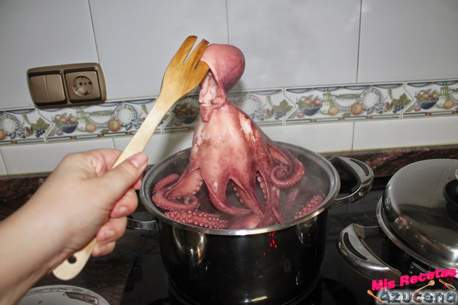 Una vez esté bien descongelado pondremos una olla grande al fuego, a fuego medio, llena más de la mitad de agua, cuando el agua rompa a hervir cogeremos el pulpo y lo asustaremos tres veces. "asustarlo es coger el pulpo por la cabeza sin soltarlo lo metemos en la olla y lo sacamos de seguida esto lo hacemos tres veces pero a la tercera yo lo dejamos dentro"