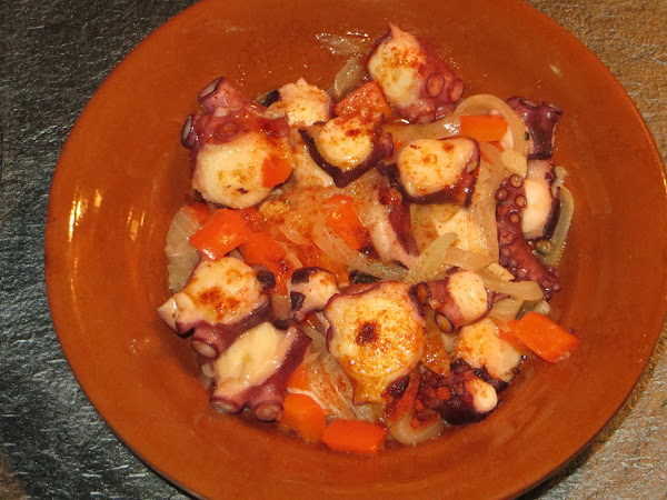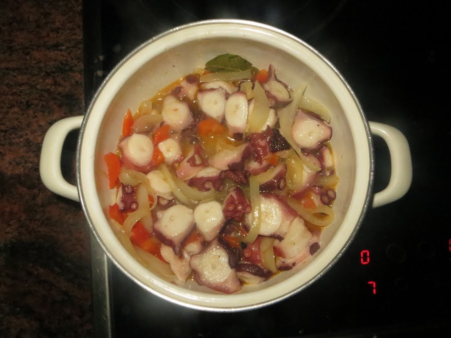 Una vez que las verduras están cocidas, añadís la hoja de laurel, el chorro de vino blanco y los granos de pimienta. Añadís el pulpo y lo dejáis cocer hasta que se evapore parte del caldo. Lo sacáis a un plato, echáis pimentón dulce por encima y ya está listo para comer.