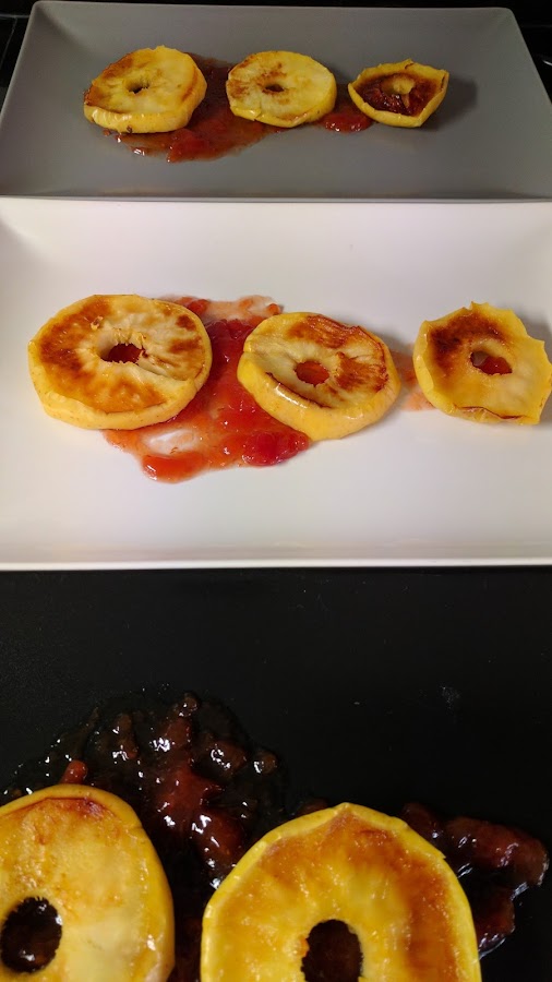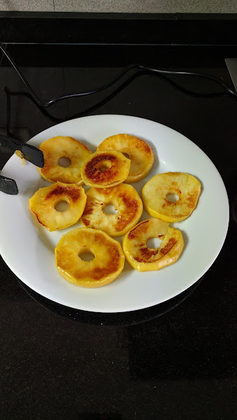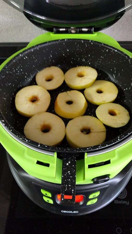 Lavamos y descorazonamos la manzana. Cortamos en rodajas gruesas. Ponemos un flush en la cubeta plana y encima las rodajas. Menú sartén, 200 grados. A los 8 minutos damos la vuelta y dejamos 6 minutos más. Han de quedar doradas pero no excesivamente blandas. Reservamos