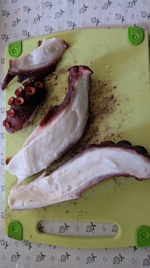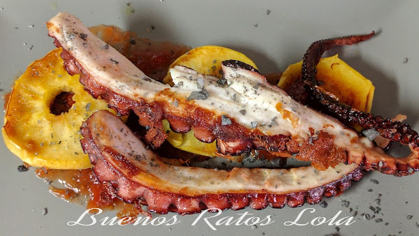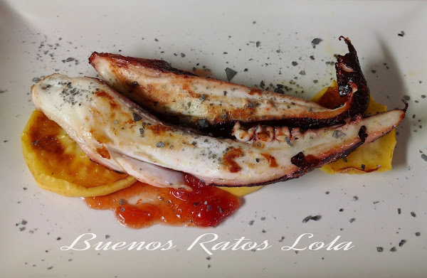 Mientras se va haciendo el pulpo ponemos en el plato una capa fina de mermelada y encima dos o tres rodajas de manzana (según sean de tamaño) y en cuanto esté el pulpo hecho lo colocamos encima, con unas escamas de sal negra que rompemos con los dedos