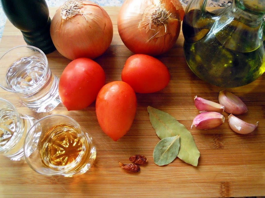 Cuando la cebolla esté transparente y bien pochada, añade las guindillas, la hoja de laurel y los tomates rallados, remueve todo junto y sube el fuego para que se cocine el tomate unos minutos.