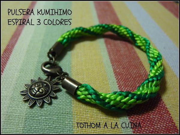 pulsera en forma de espiral, trenzada en tres tonos de color verde. Cierre color oro viejo y abalorio del mismo color en forma de sol