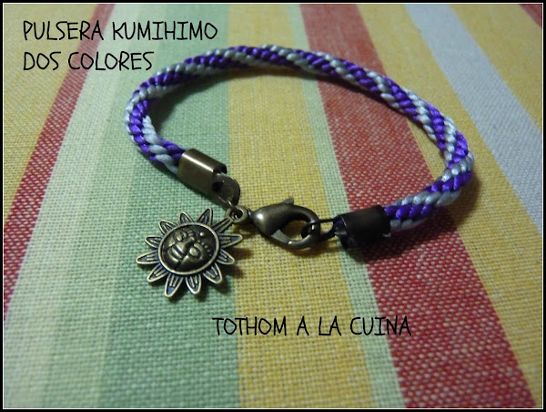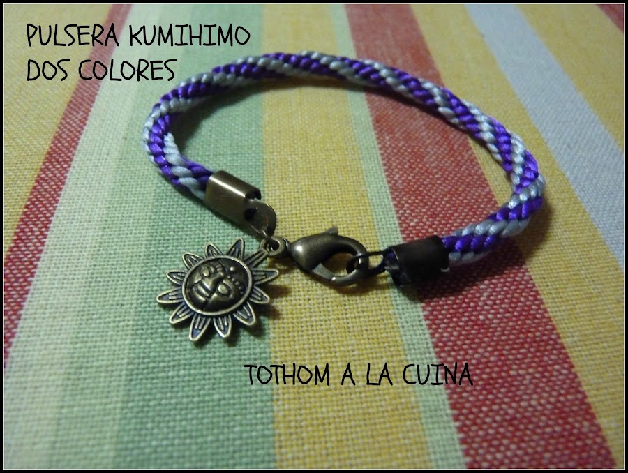 Empezamos con una pulsera redonda, trenzada en morado y plateado. Cierre color oro viejo y abalorio del mismo color en forma de sol