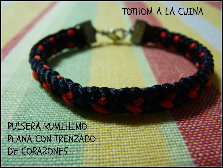 pulsera plana, trenzada en negro y rojo, con detalles en el trenzado en forma de corazón. Cierre plano, de color plateado y esta sin abalorio de adorno.