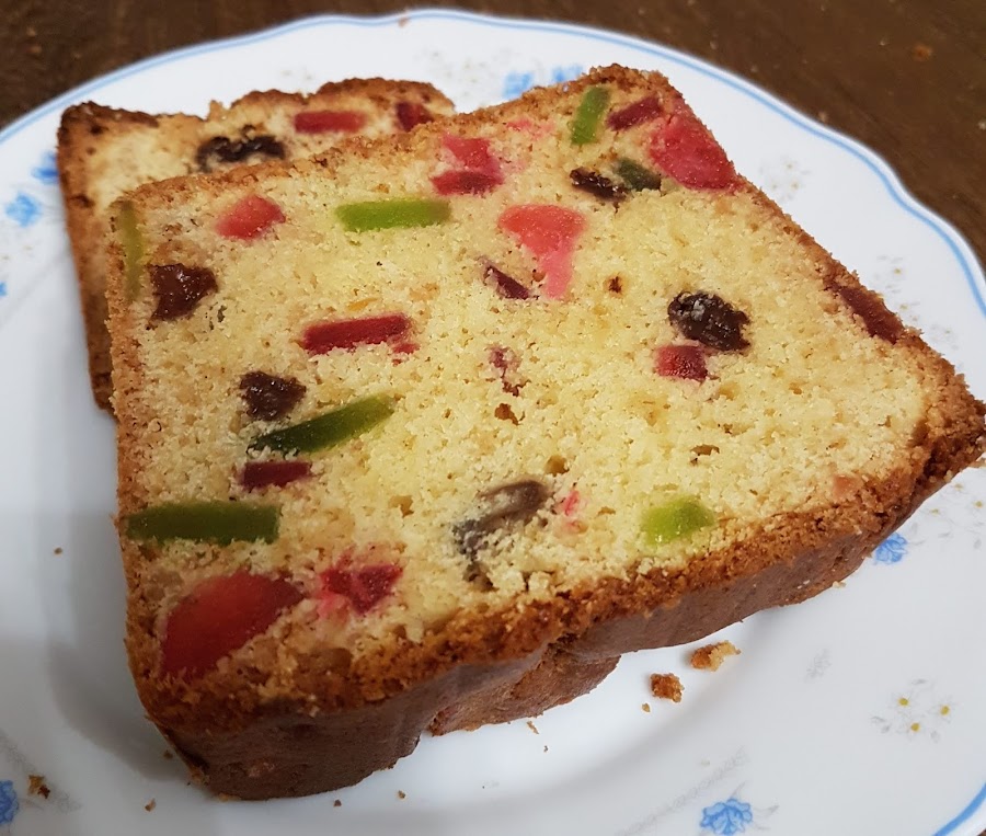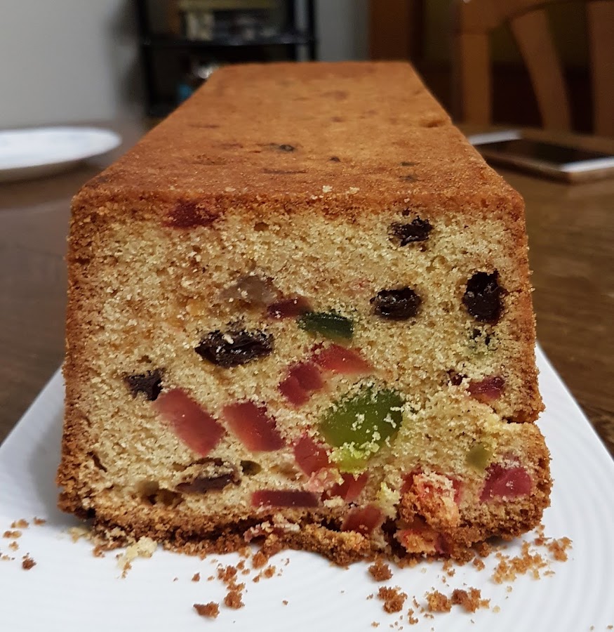 Tamizamos la harina con la levadura (polvos de hornear). Añadimos la harina a velocidad baja, cuando esté toda bien integrada pondremos las frutas confitadas y las pasas que habremos pasado ligeramente por harina para evitar que se vayan al fondo del bizcocho.
