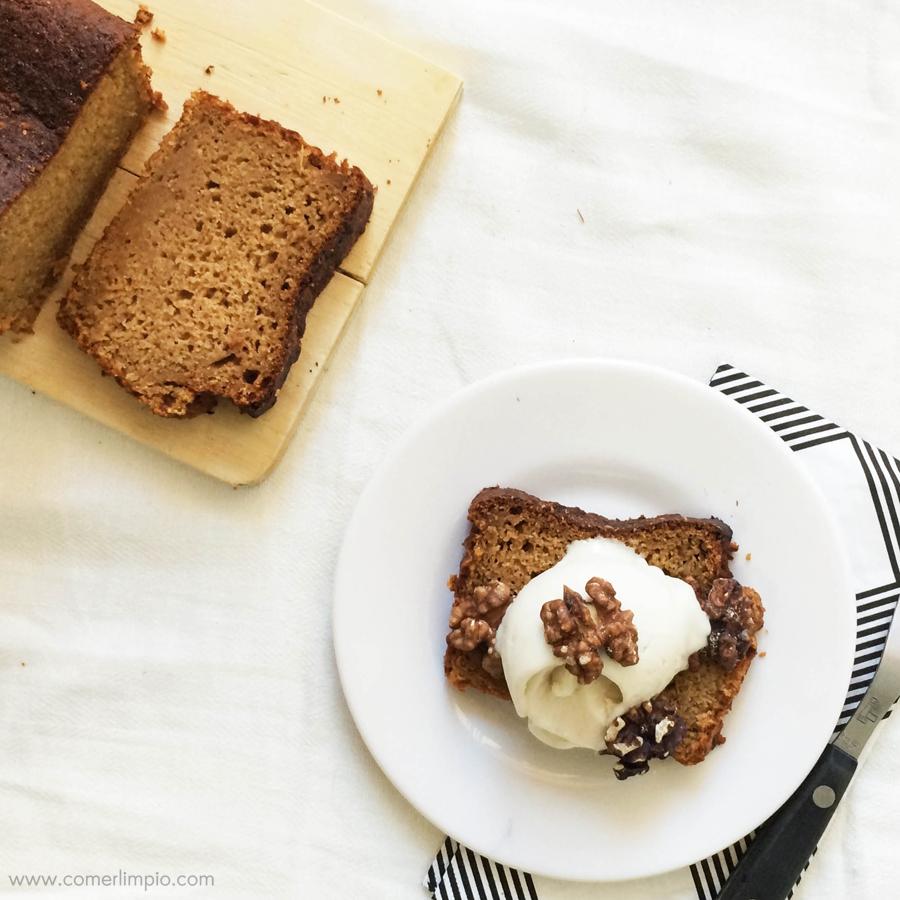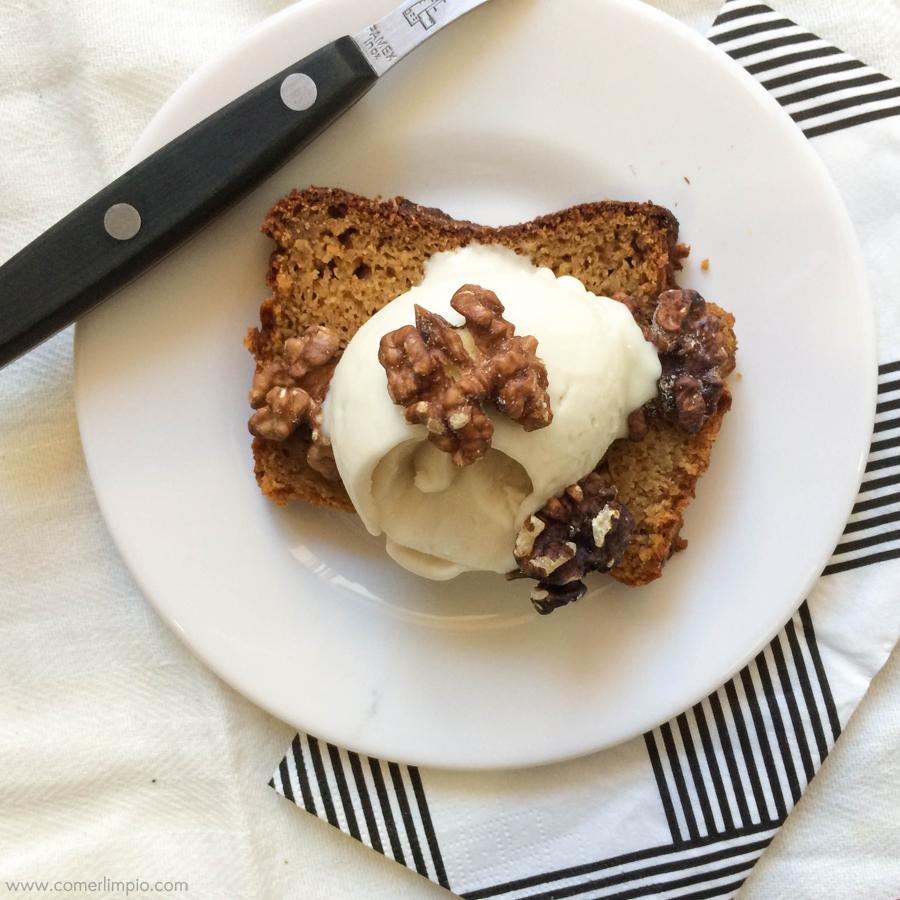 En la foto, acompaño el pumpink bread con helado vegano de coco y horchata (si azúcar, claro) y unas nueces por encima. Pero puedes tomarlo solo, con mermelada, con frutas o con lo que te apetezca ¡Éxito asegurado!
