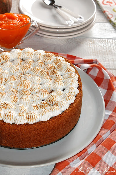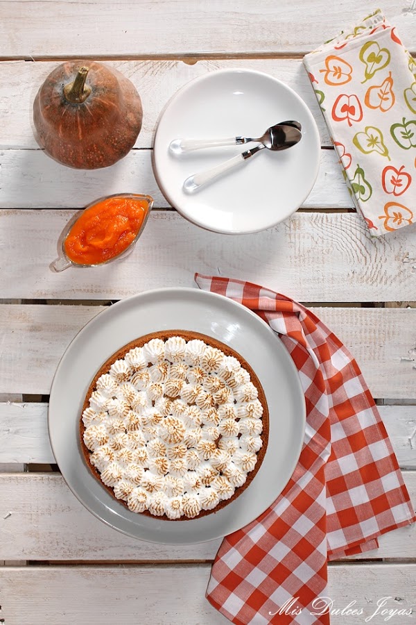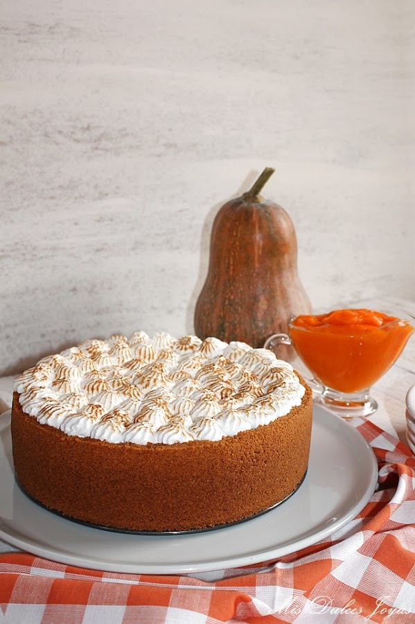 Si os preguntáis si la tarta sabe mucho a calabaza, os diría que no, sabe a queso, la calabaza le aporta textura, por supuesto que se nota pero muy en el fondo, lo que si se nota son las especias que lleva, como el clavo, la canela, el jengibre y la nuez moscada. La combinación de la calabaza y las especias que lleva, la hacen irresistible e diferente al resto de las tartas de queso. Como podéis ver se compone de una base de galletas trituradas, relleno de queso y calabaza, y yo la he decorado con merengue (al cual he tostado con un soplete), pero se puede decorar con nata montada (crema de leche) o servirla tal cual. Por norma general las tartas de queso horneadas se hornear al baño maría, pues esta no hace falta hornearla a baño maría y esto es lo que me encanta de esta receta. Te evitas el forrado del molde con papel de aluminio y la preparación se agiliza bastante. Para que quede perfecta solo hay que hornearla a temperatura media, media- baja, y tener paciencia antes de desmoldarla, ya que hay que dejarla que se termine de hacer con el horno apagado y luego hay que dejar que enfríe el tiempo necesario en el molde. Por lo de más es pan comido !!! Si os gustan las tartas de queso horneadas tomar nota de esta receta, os va ha encantar. !!!!