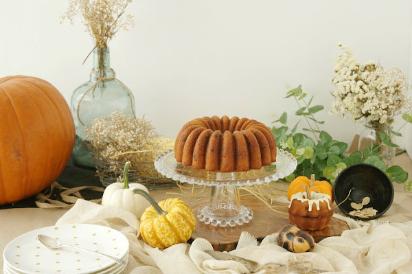 Este mes en el reto de #BundtBakers, ya sabéis, ese grupo de apasionados por los bundts que cada mes se reúne para hornear un delicioso bundt del tema elegido por un anfitrión, tenemos como anfitriona a Teri de The Freshman Cook y como tema elegido "Happy Fall, Yall". Desde que lo vi me pareció un tema estupendo y me ha encantado hacer este bundt de calabaza con chispas de chocolate.