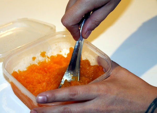 1 kg de calabaza, cortar en trozos, pelar (para pelar más rápido, poner los trozos con piel en un plato al microondas 5 minutos) y cocer con muy poca agua. Escurrir y chafar con un tenedor.