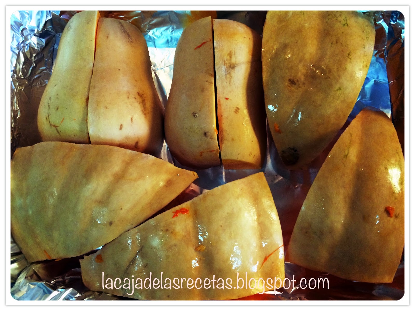 Cortamos la calabaza en varios trozos grandes y sacamos las pipas. Colocamos al papillote con la piel hacia arriba en una bandeja de horno. Esto es, envolvemos la bandeja con papel de aluminio.
