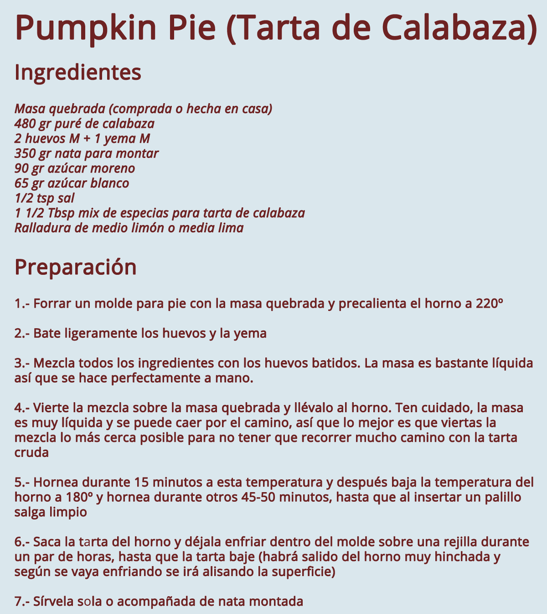 Tampoco se puede quejar mucho, que después es ella la que la puede probar y según dice está deliciosa y no es nada pesada, cosa que pensó al leer la receta. No me extraña que sea la tarta clásica que se sirve de postre en el día de Acción de Gracias