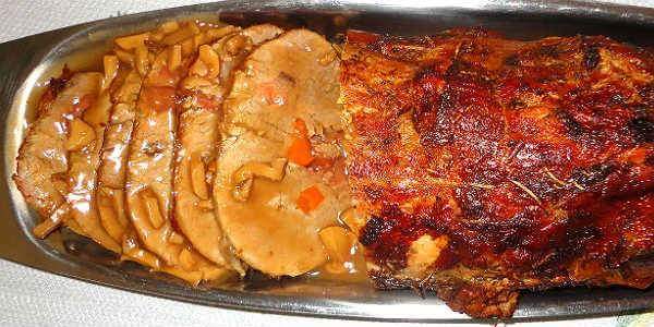 En un tazón mezclar la pasta de tomate,mostaza,salsa inglesa,azúcar moreno,sal,pimienta,ajo triturado ya bien mezclado cubrir la carne colocar en una cazoleja para horno a la que cubrimos con rebanadas de cebolla luego agregar la gaseosa de cola,vino tinto,tomillo,hojas de laurel y los hongos rebanados cubrir con papel aluminio llevar al horno a 350grados por 1hora y 15minutos pasado el tiempo eliminar el papel aluminio y dejar en broil para dorar,ya lista colocar en un platon rebanar la carne colocar las rebanadas de cebolla en la licuadora junto con vino tinto a gusto licuar colocar en una olla junto con los jugos de cocción de la carne espesar a gusto con fecula de maíz disuelta en agua dejar hervir bien rectificar sal y pimienta servir en una salsera para acompañar las rebanadas de punta de solomo.