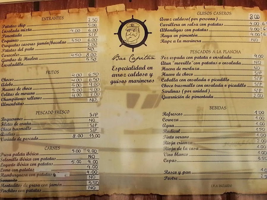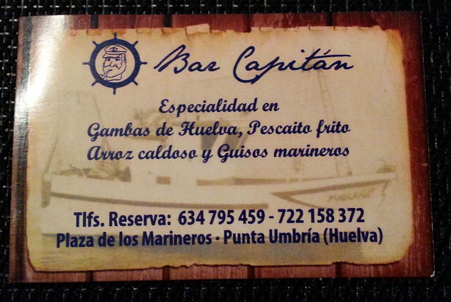 Aquí os dejo la dirección y la carta para que no dudéis ni un momento en pasar por el Bar Capitán y disfrutar de su comida y su magnífico trato. Por cierto..... no hay que perderse su arroz pero tenéis que llamar antes para encargarlo!!!!