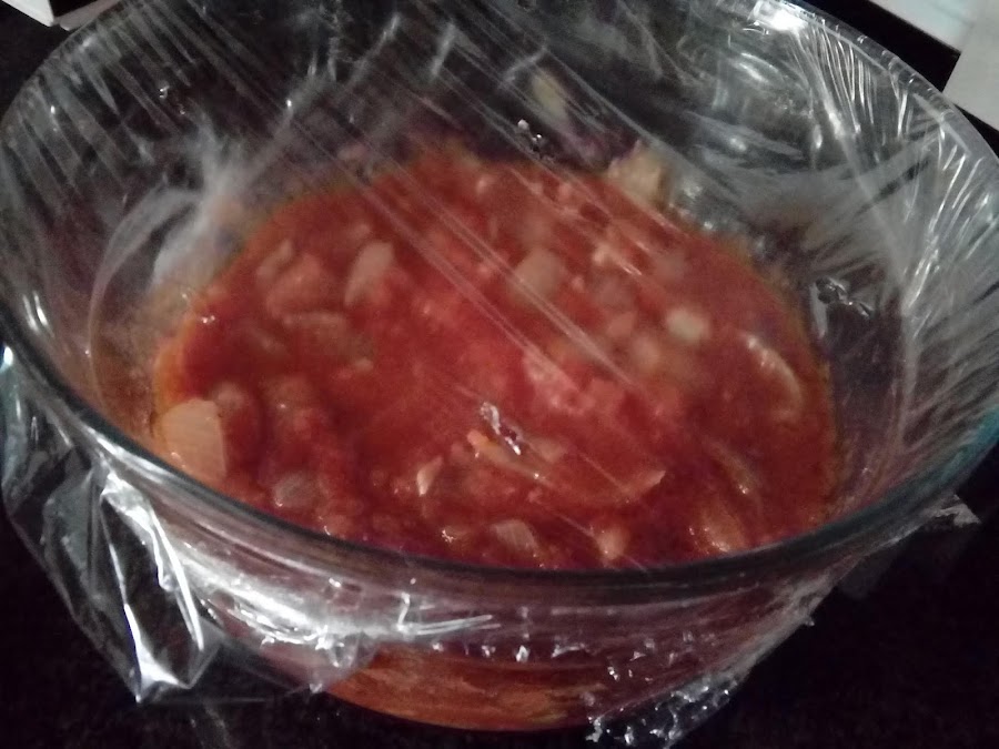 Añadimos el tomate, tapamos con film y agujereamos. Introducimos 10 minutos más.