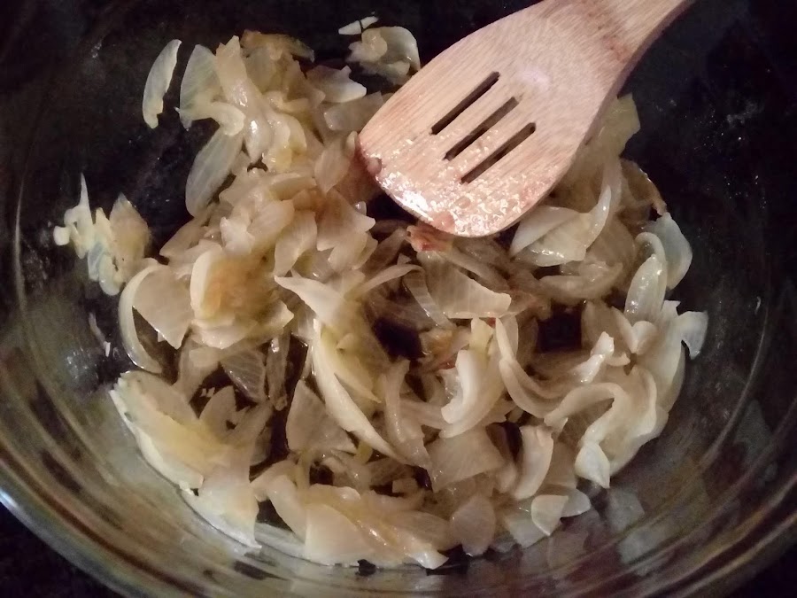Picamos la cebolla en juliana y ponemos en el recipiente junto con el aceite de oliva. Removemos y metemos 10 minutos en el micro a máx. potencia (750 w).