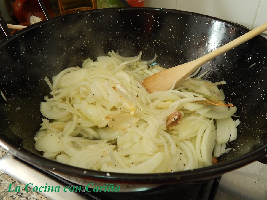 En un buen perol, ponemos el aceite a fuego suave y la añadimos los ajos. Cuando empiecen a oler, la cebolla con un poquito de sal. Tapamos y al mínimo, moviendo de vez en cuando.