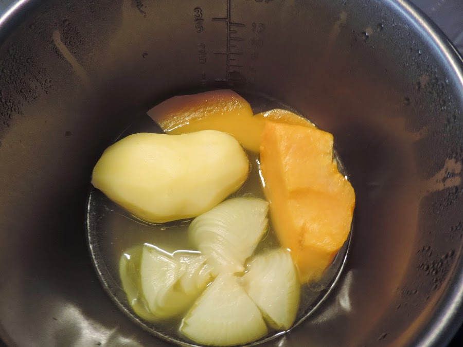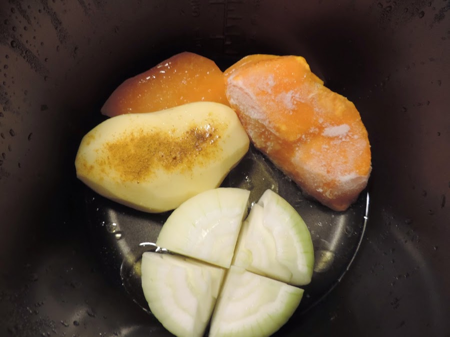 Ponemos en la olla la calabaza, patata, cebolla, agua, sal, 1 cucharadita de aceite de oliva y curry,