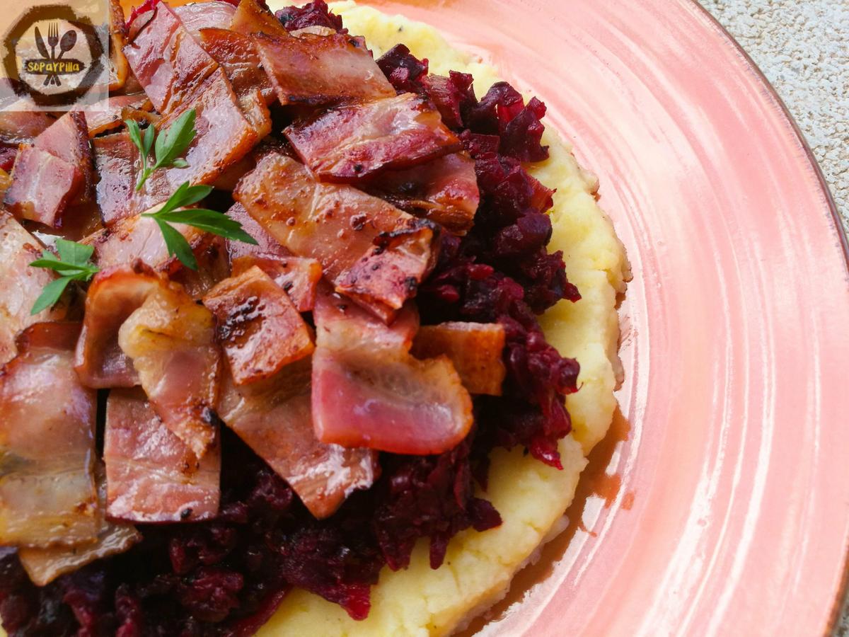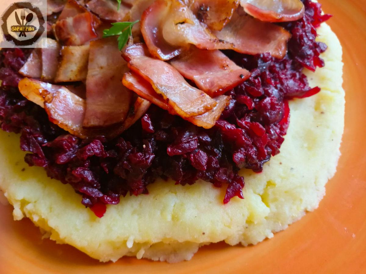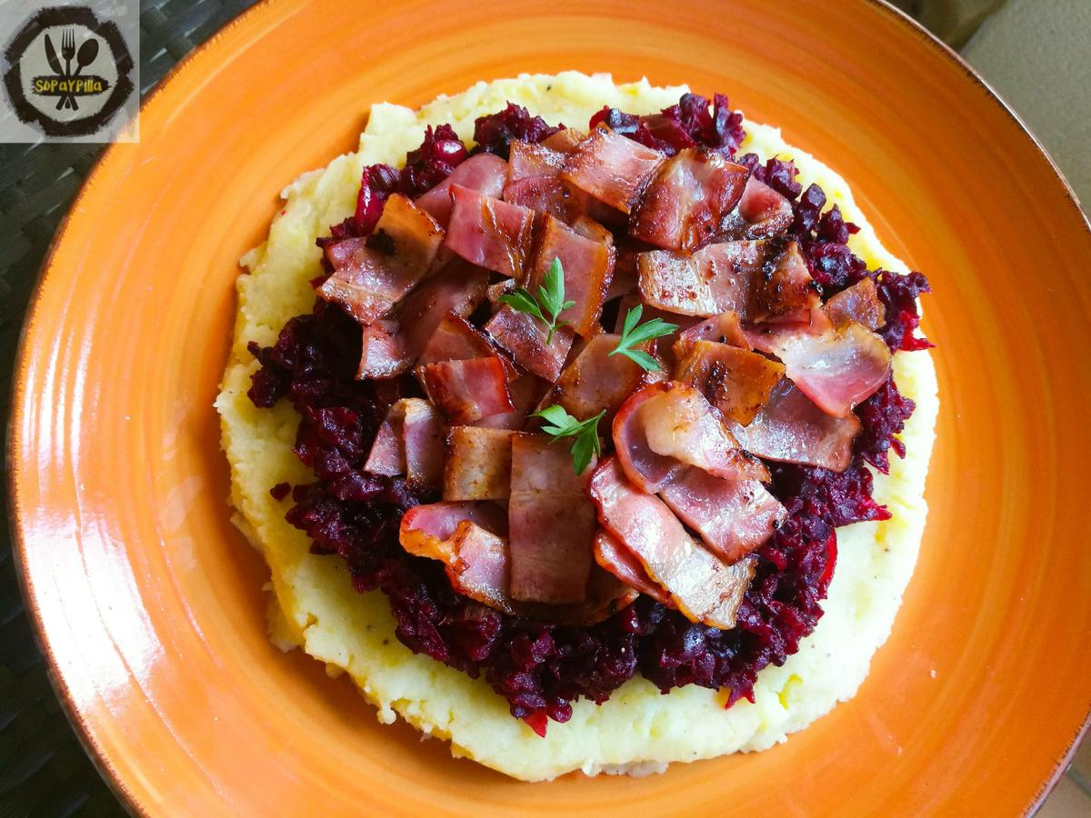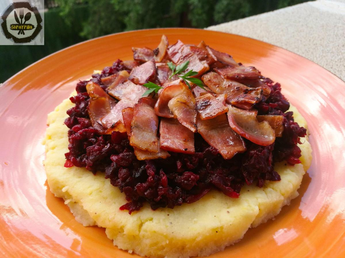 Servimos el puré y lo coronamos con un topping de la remolacha y el bacon. Decorar con perejil.