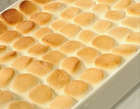 En la batidora coloque el ayote cocinado sin sus semillas y pelado batir,agrege el azúcar moreno,huevo,sal,canela,ralladura de naranja y vainilla batir a incorporar bien,ya listo colocar en un pirex rectangular grande engrasado ahora colocamos los marshmallows sobre el puré,llevar al horno a 350grados f por 25min o al dorar ligeramente los marshmallows.