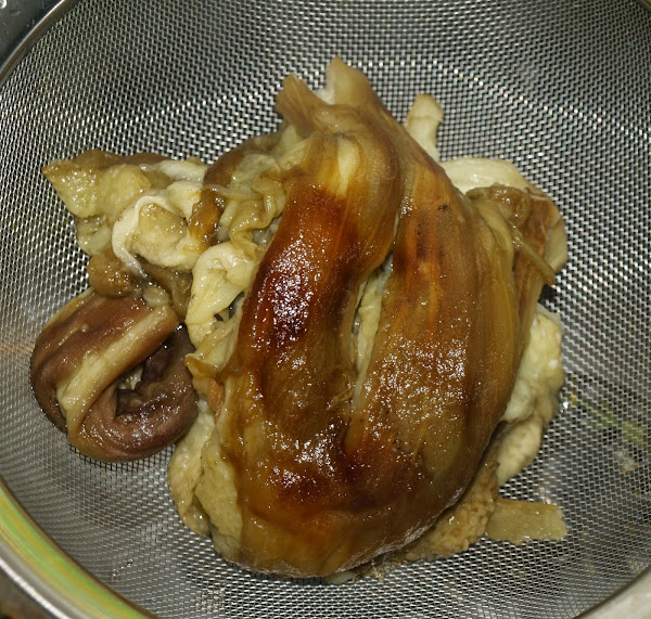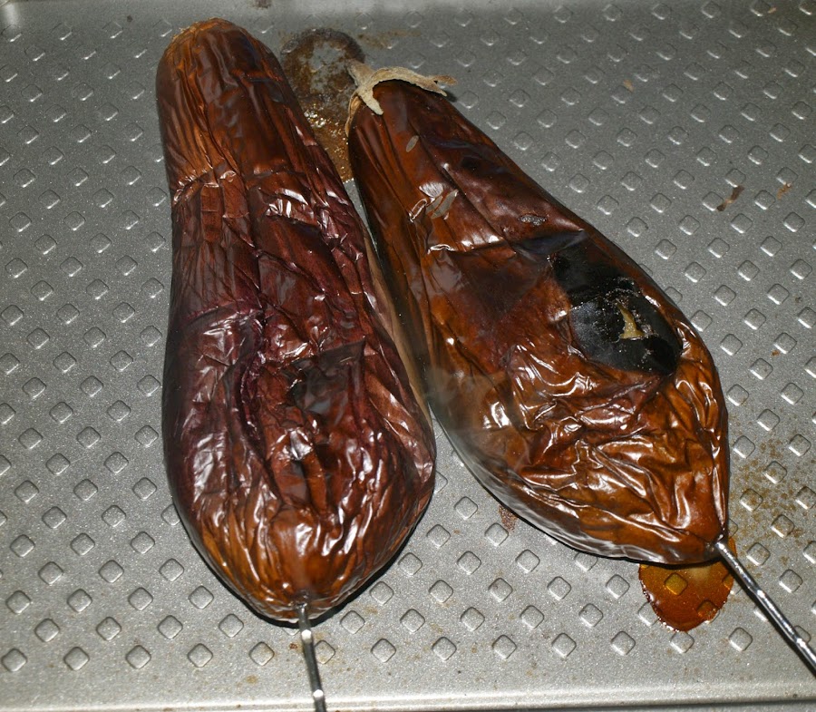- Pues bueno, ponemos las berenjenas en el horno, en mi caso y las asamos debajo del grill, moviéndolas de vez en cuando para que se hagan por todos lados, hasta que piel esté oscura, casi quemada o sin casi, y la carne bien tierna.