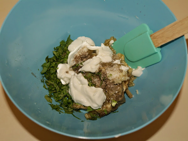 - En un bol ponemos las berenjenas ya listas junto con el yogur, el ajo prensado, el zumo de limón, aceite (opcional) y el perejil, o cilantro en su defecto (si lo preferís, también podéis dejar el perejil para adornar al final, encima del puré, en lugar de mezclarlo). Mezclamos bien. Salpimentamos al gusto y volvemos a mezclar muy bien, machacando un poco más para dar más consistencia de puré. Si queréis también podéis pasar la mezcla por la batidora, para hacerla totalmente crema, aunque normalmente se deja una textura algo grosera, con tropezones de berenjena. A mí me gusta más.