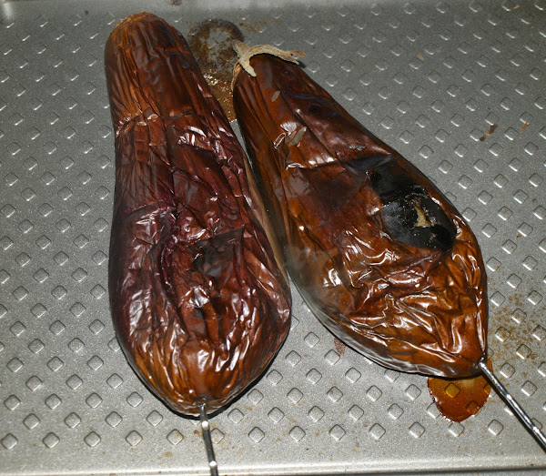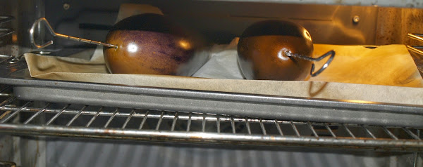 - Normalmente se suele hacer quemando las berenjenas en el hornillo de las cocina, que es como mejor quedan, como adquieren un sabor más marcado. Si no tenéis, como yo que tengo vitrocerámica, las podéis preparar fácilmente en el horno, poniéndolas bajo el grill para tostarlas más o asándolas normalmente. La ventaja del horno es que el lío montado en la cocina es menor. Es mucho más limpio y fácil. Eso sí, en cualquier caso no os olvidéis de hacer unos cortes en la piel para que no exploten, pues entonces sí que se armaría una gorda, jeje. (Y por supuesto, si podéis asarlas en la barbacoa, será con diferencia lo mejor de lo mejor, pero tanto no exijo :D ).