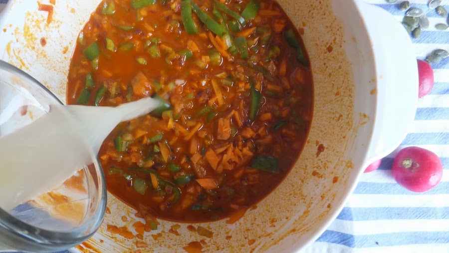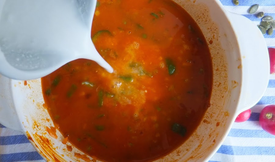 9. Tritura el puré con la batidora hasta que quede suave y homogéneo. Añade el azúcar (es opciona y sirve para contrarrestar el picante), la sal y la pimienta y prueba para rectificar la sazón.