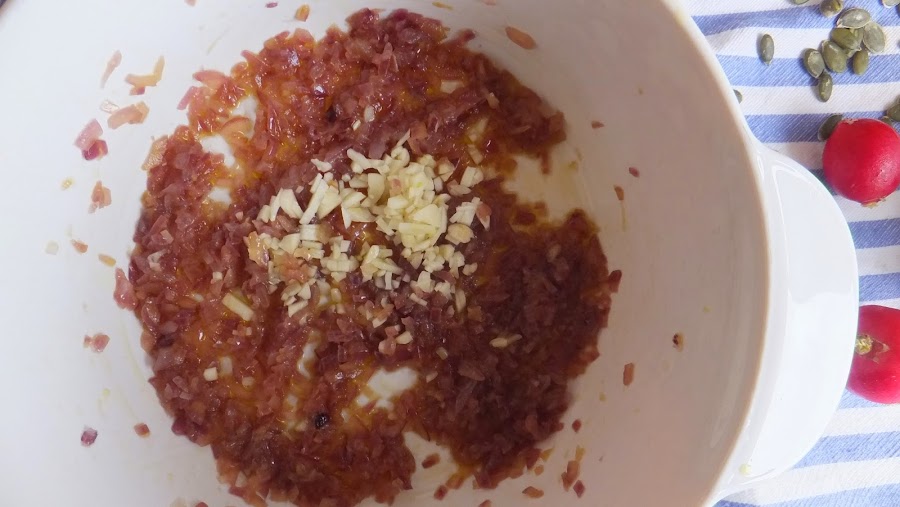 3. Añade el ajo y continua sofriendo, removiendo de vez en cuando, hasta que comience a soltar aroma y a dorar.