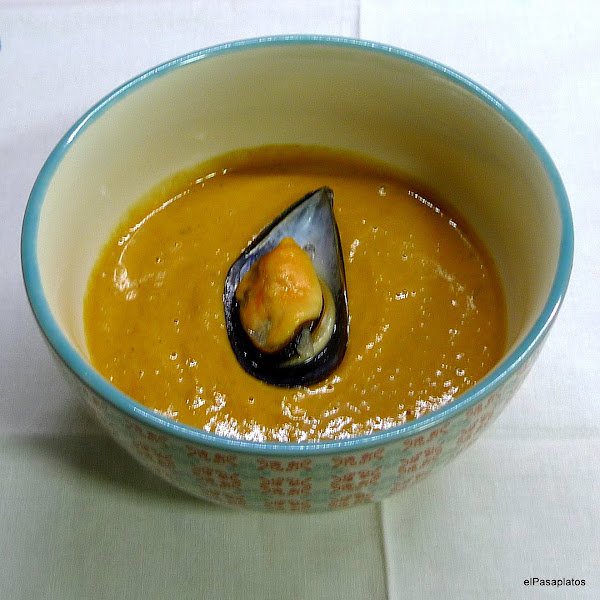 En la misma cazuela y en el jugo de cocer los mejillones, cocinar la calabaza y el boniato con una cucharadita de curry. Completar con agua hasta cubrir. Cocinar a fuego medio durante veinte minutos.