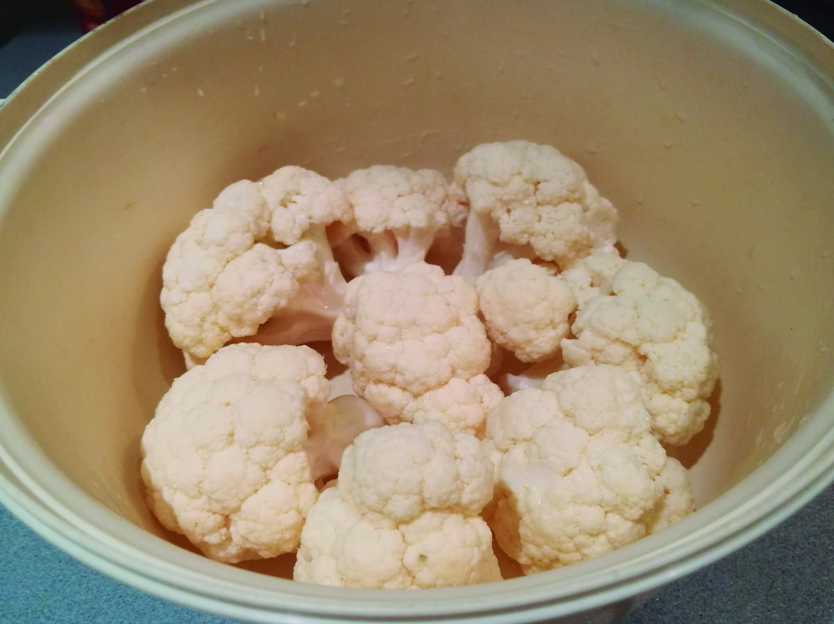 Cortamos la coliflor en flores, la lavamos y la secamos bien, porque la coliflor suelta agua y no queremos añadirle mas agua. Pelamos los ajos.