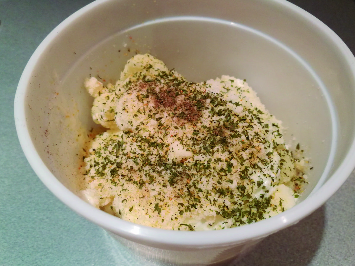 Echamos la coliflor y los ajos en un bol o vaso de batidora y le añadimos en nuestro caso un chorrito de aceite de oliva y el queso fresco batido y lo batimos todo junto. Echamos sal, pimienta, perejil y nuez moscada al gusto y removemos bien. Tened cuidado con la nuez moscada porque da mucho sabor.
