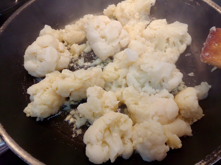 Una vez caliente el aceite (no hay que dejar que los ajos tomen color), incorporar la coliflor