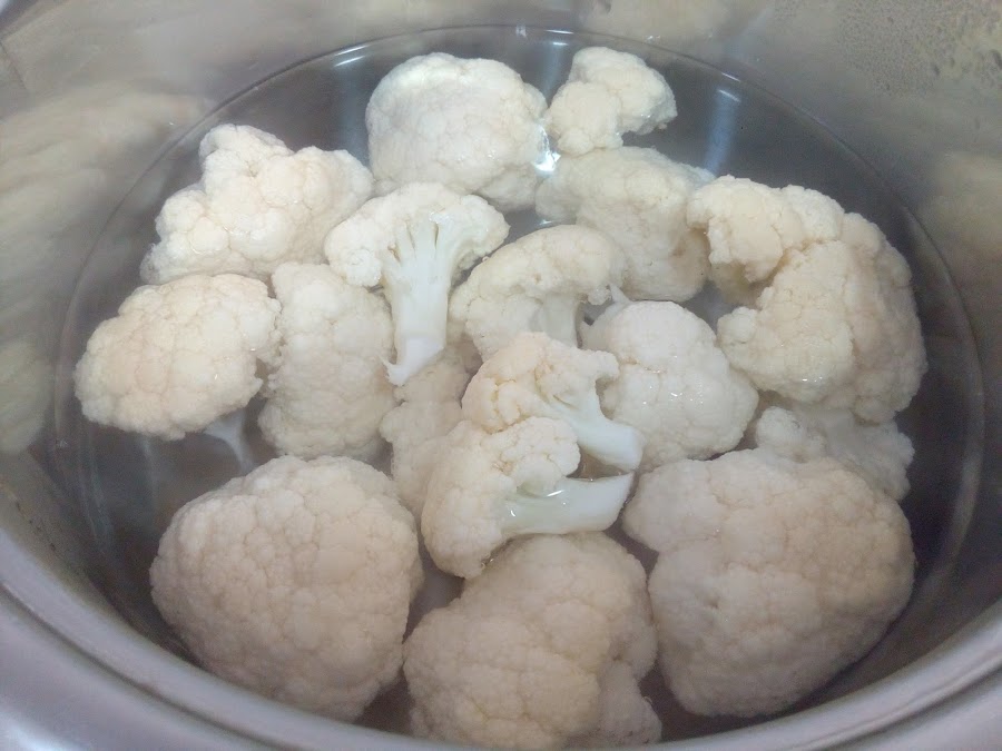 En una cacerola con agua con un poco de sal, introducir los trozos de coliflor de forma que queden totalmente cubiertas