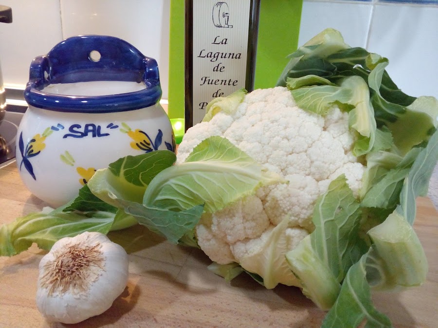 Una coliflor mediana (procurar que estén prietas, sin manchas y con las hojas frescas), seis dientes de ajo, sal y aceite de oliva virgen extra (a ser posible malagueño).