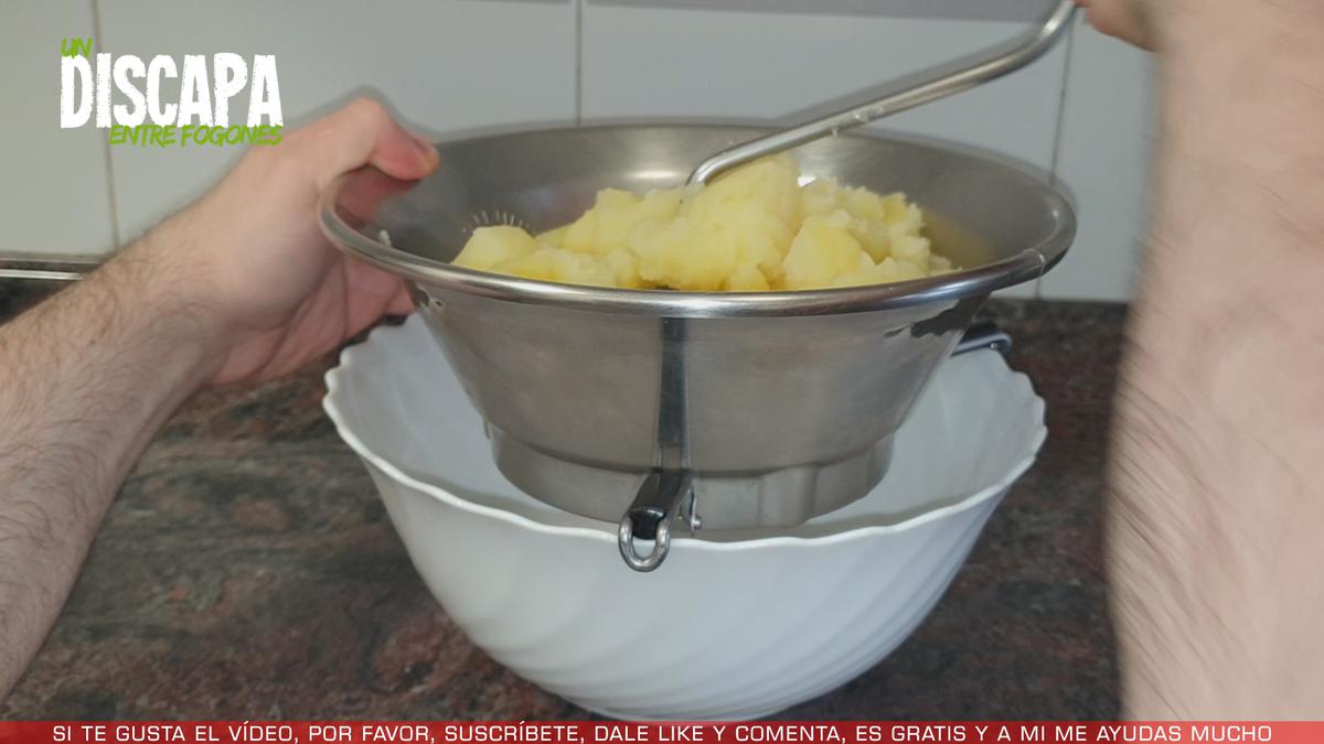 2Una vez que se han cocido las patatas, las añadimos a un pasapurés y procedemos a triturarlas.