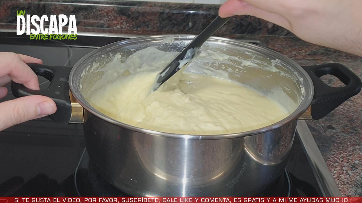 Después añadimos la nata (crema de leche) líquida y la incorporamos y si se quiere se puede añadir un poco de queso rallado, yo le voy a poner un poco de queso emmental.