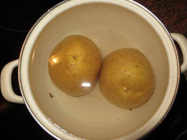 Ponemos el agua a hervir, lavamos las patatas, pero les dejamos la piel. Cuando el agua esté hirviendo añadimos la cucharada de sal y las patatas. Bajamos el fuego y dejamos hirviendo las patatas hasta que cuando pinchemos con un cuchillo estén blandas.