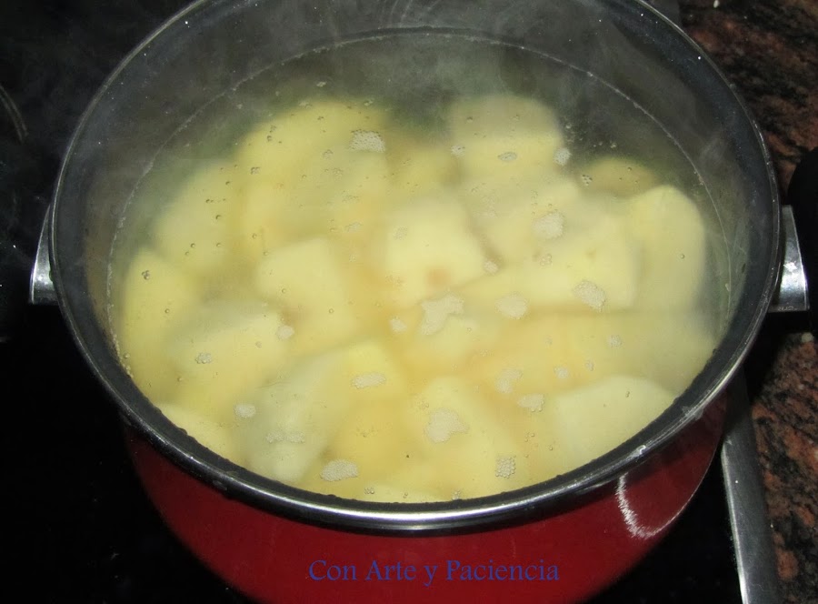 En una olla ponemos a cocer las patatas con un poco de sal a fuego alto unos 20 minutos o hasta que estén tiernas.