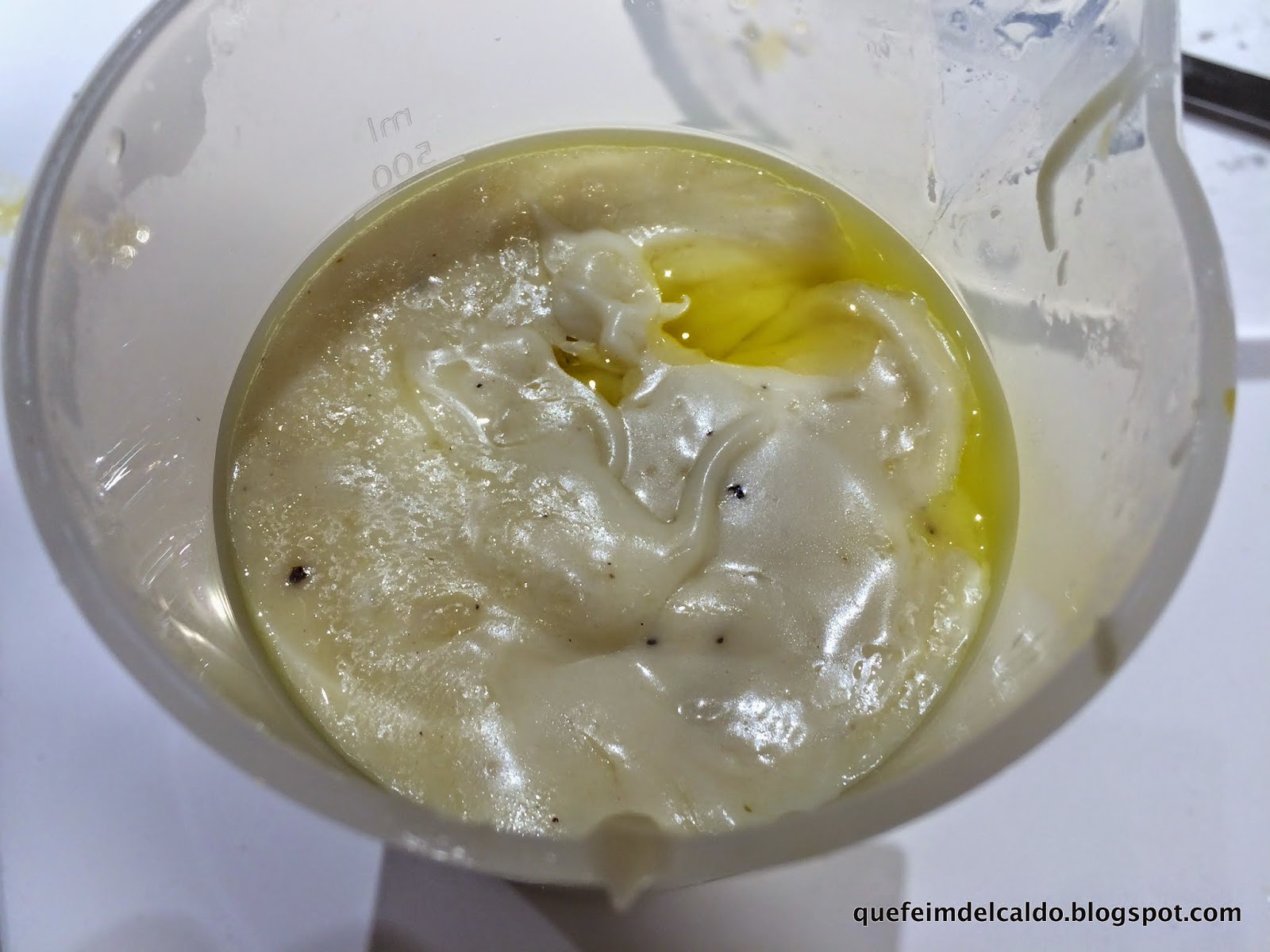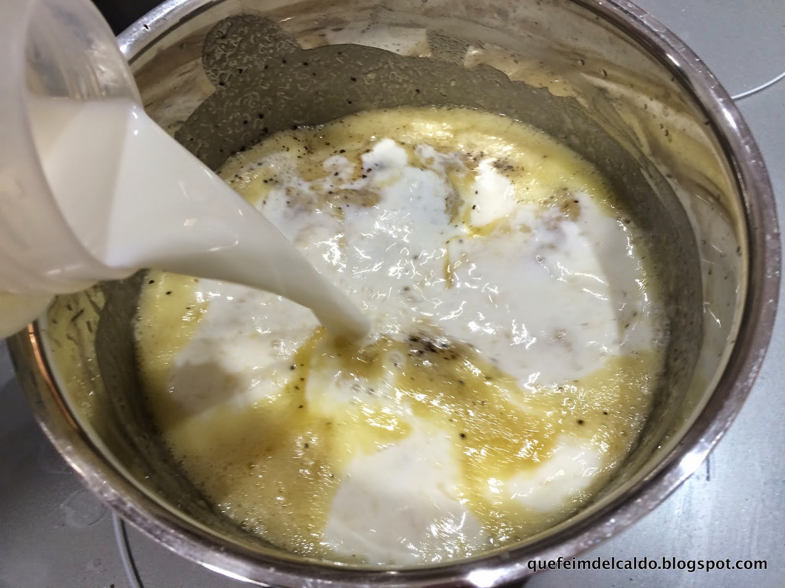 Con la ayuda de una batidora eléctrica trituramos el cazo con los ajos, la harina y la leche, tiene que estar muy triturado.
