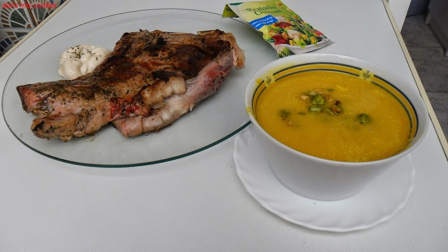 Trituramos hasta convertir en un puré. En el momento de servir lo acompañamos con picatostes y en una parrilla aceitada asamos los chuletones en su punto de sal .